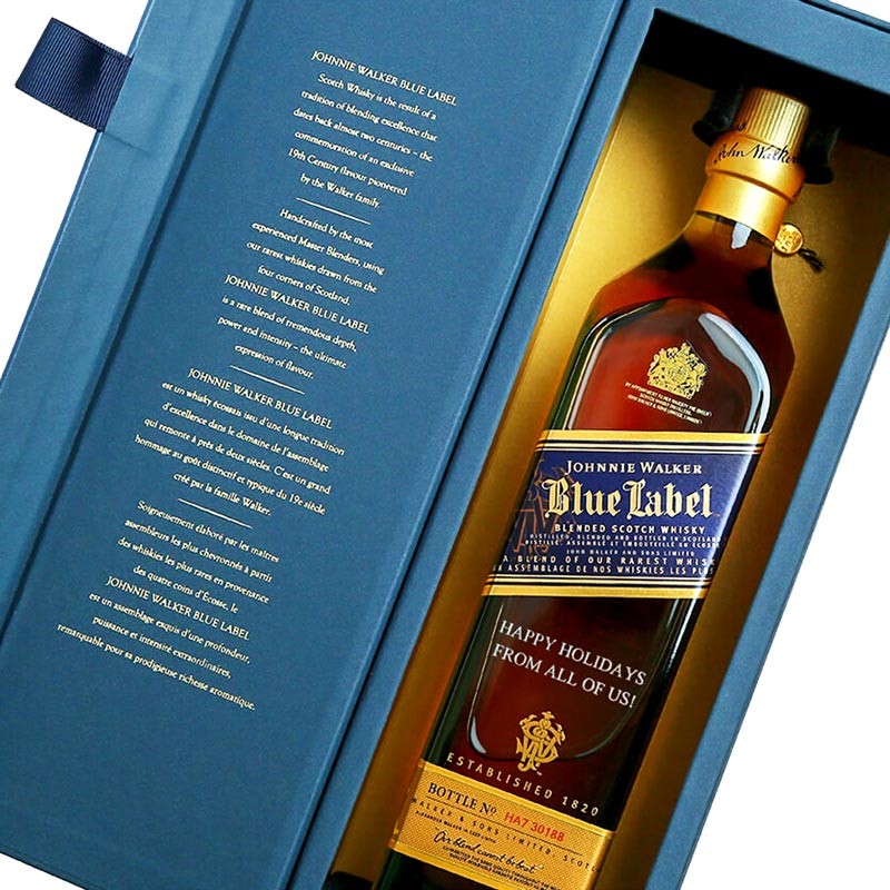 Johnnie Walker Blue Label is incomparably rich and smoky, with velvety smooth breaking waves of powerful flavour. Hazelnuts, honey, sherry and oranges tumble in first, before releasing hidden secrets like ginger, kumquats, sandalwood and dark chocolate. A rich honey sweetness emerges, accompanied by hints of pepper and dried fruits, before an impossibly long, lingering, smooth finish of perfectly balanced, soft smoke.